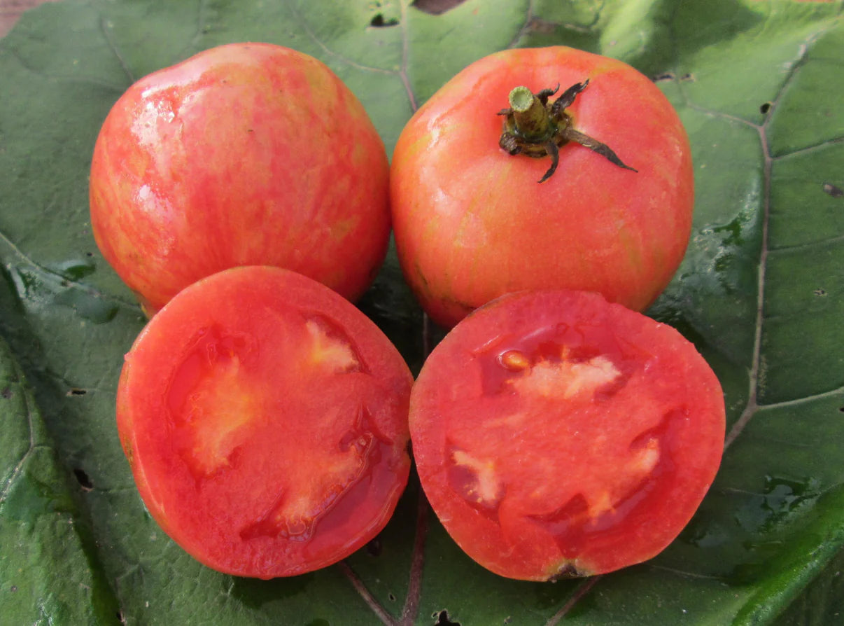The Pink Furry Boar Tomato Seedling is a rare and flavorful variety with a pink and yellow striped appearance when ripe. It is a meaty tomato with a sweet flavour and a slightly acidic finish.